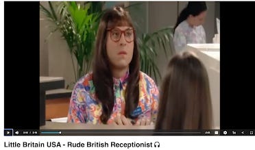 Little Britain USA-Rude British Receptionist: https://yewtu.be/watch?v=ZDxIFQLOiV0